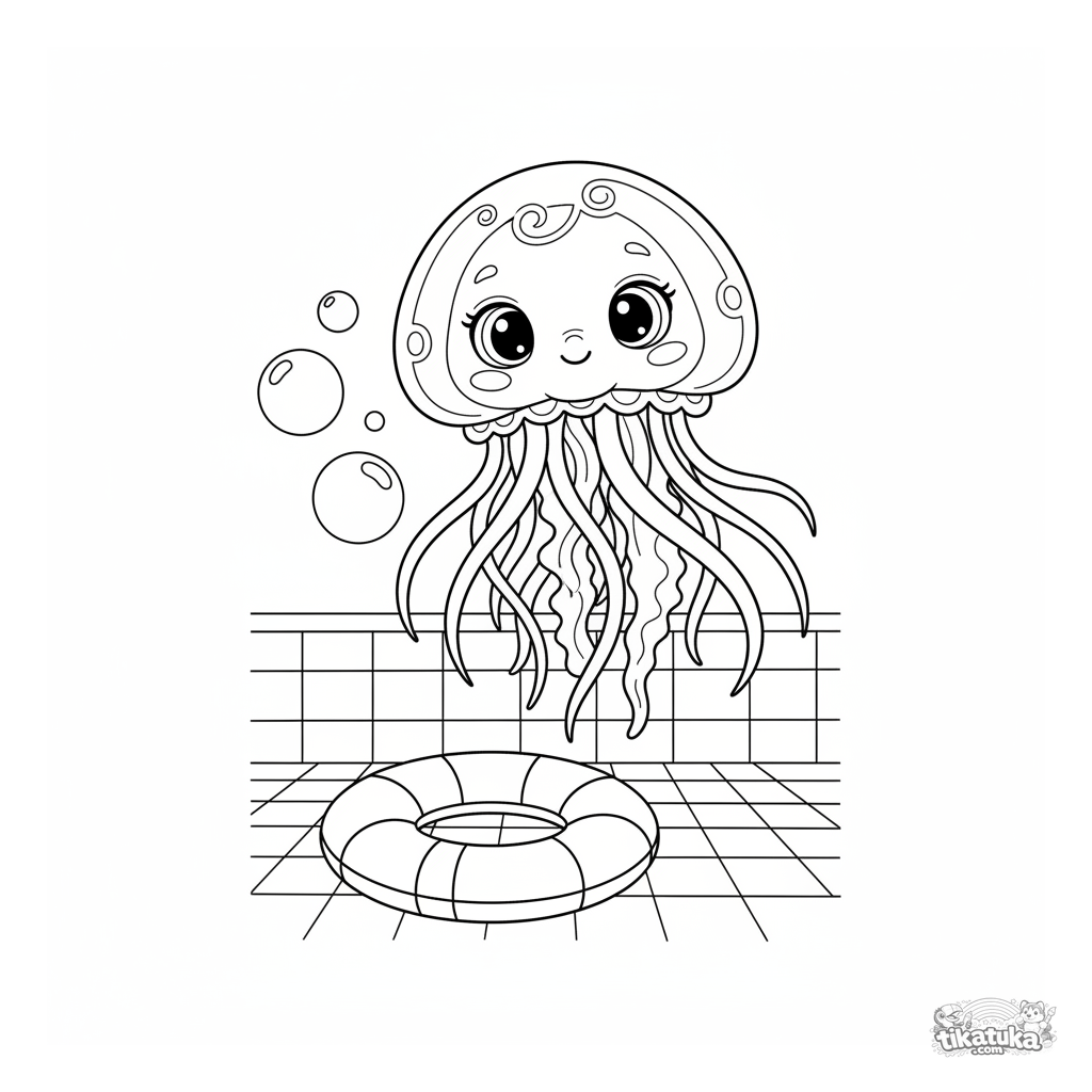 Раскраска с светящейся медузой, дрейфующей на дне бассейна рядом с кругом. Для детей 7-9 лет. Нежные линии и плавные формы.