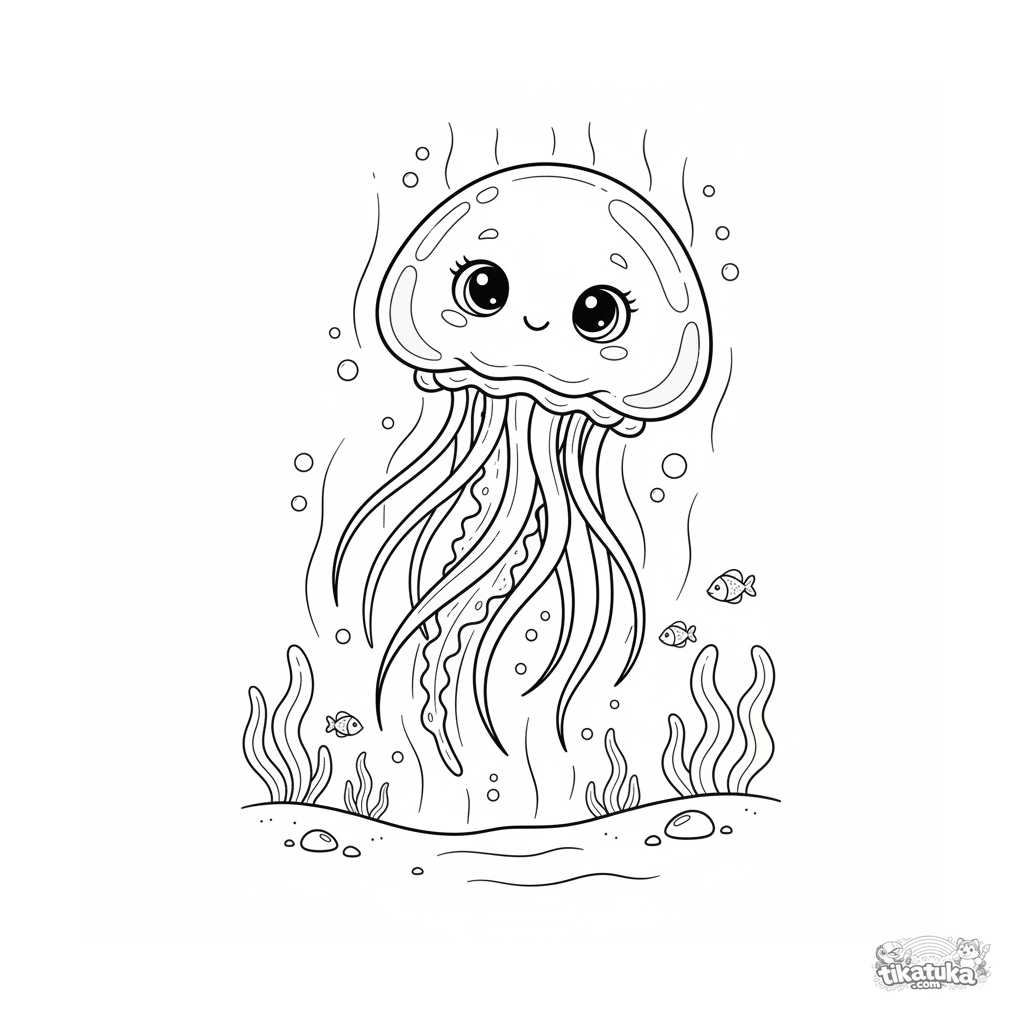 Раскраска с изящной медузой, медленно плывущей в столбе солнечного света на мелководье. Для детей 7-9 лет. Плавные линии, спокойная атмосфера.