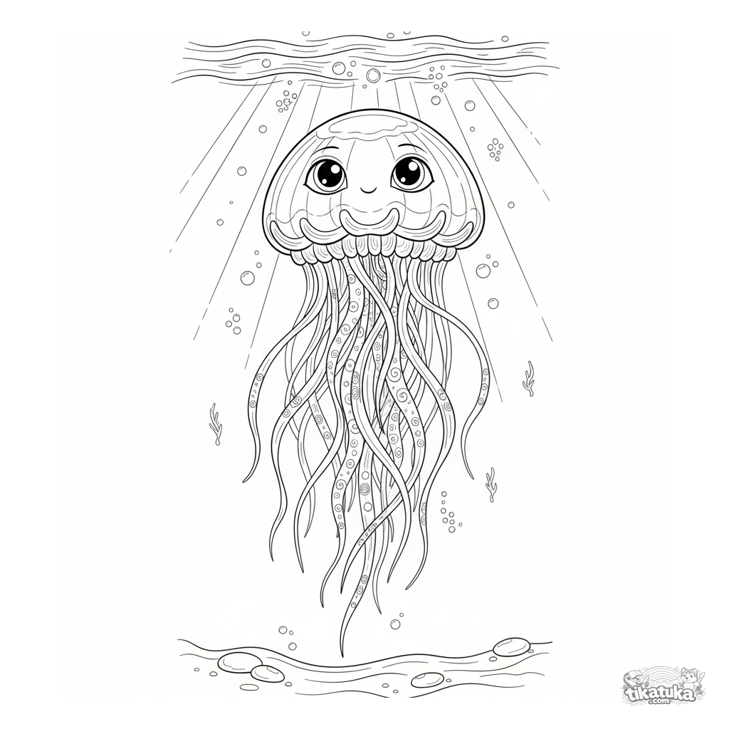 Детальная раскраска медузы, плывущей в солнечных лучах у поверхности мелководья. Для детей 10-12 лет, реалистичный стиль, развивает внимание к деталям.