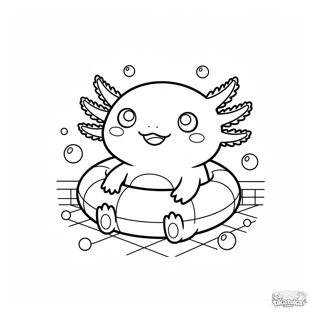 Раскраска с милым аксолотлем на дне бассейна с надувным кругом. Для детей 4-6 лет. Милые водные существа в простой сцене.