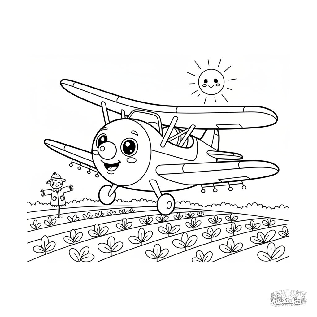 Раскраска для детей 4-6 лет в милом кавай-стиле: маленький самолет-опылитель с улыбкой летит над фермерским полем. Яркие, дружелюбные формы.