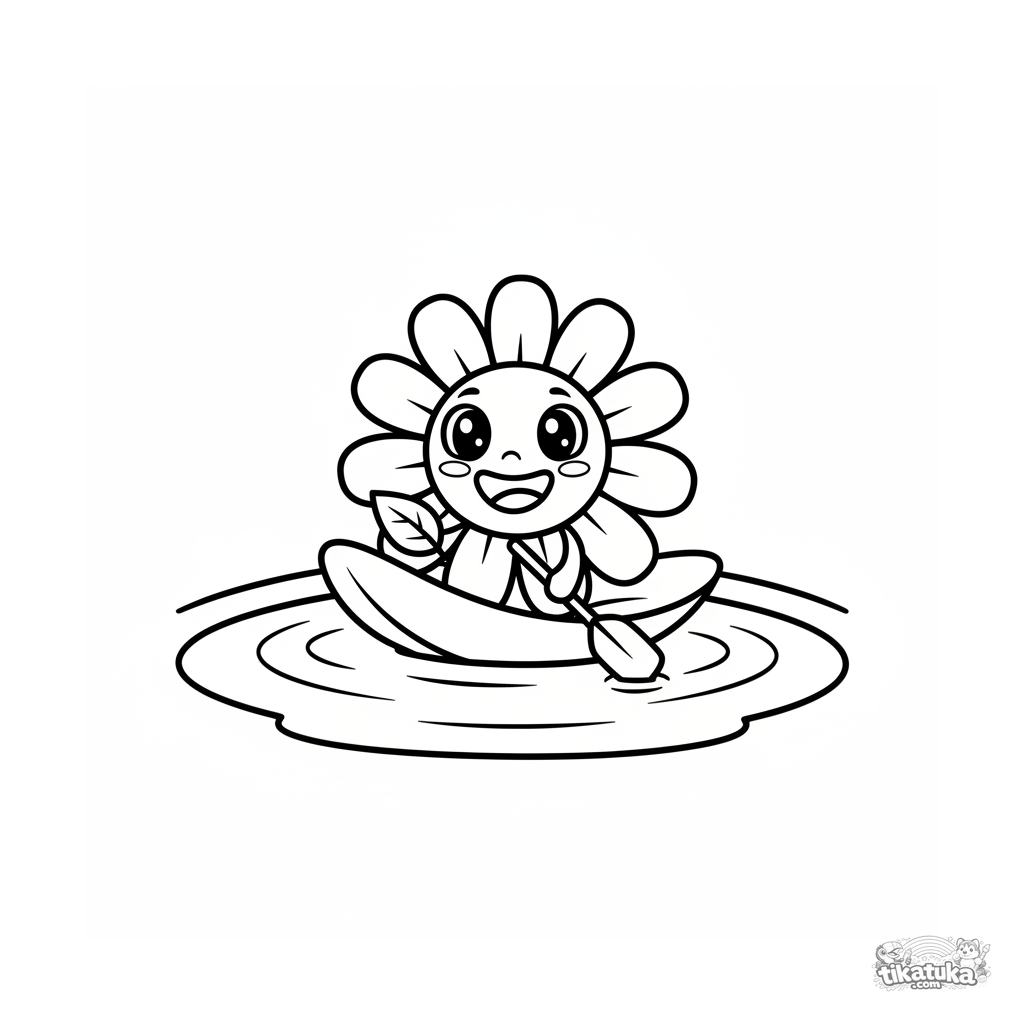 Простая раскраска для малышей 2-3 лет. Улыбающаяся ромашка с лицом плывёт на листе по пруду. Крупные простые формы, очень широкие поля для раскрашивания.