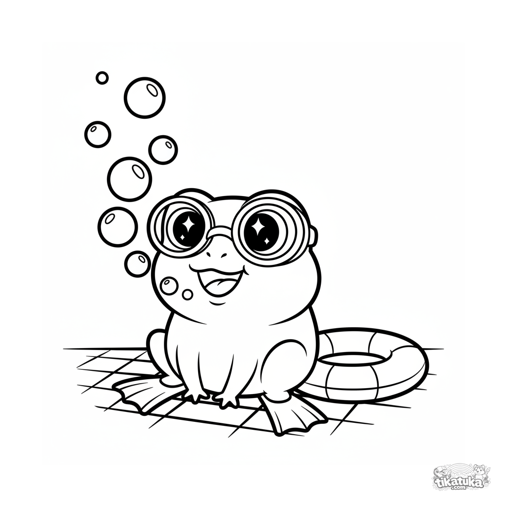 Раскраска для малышей 2-3 лет: милая лягушка в очках для плавания сидит на дне бассейна рядом с надувным кругом. Крупные простые формы.
