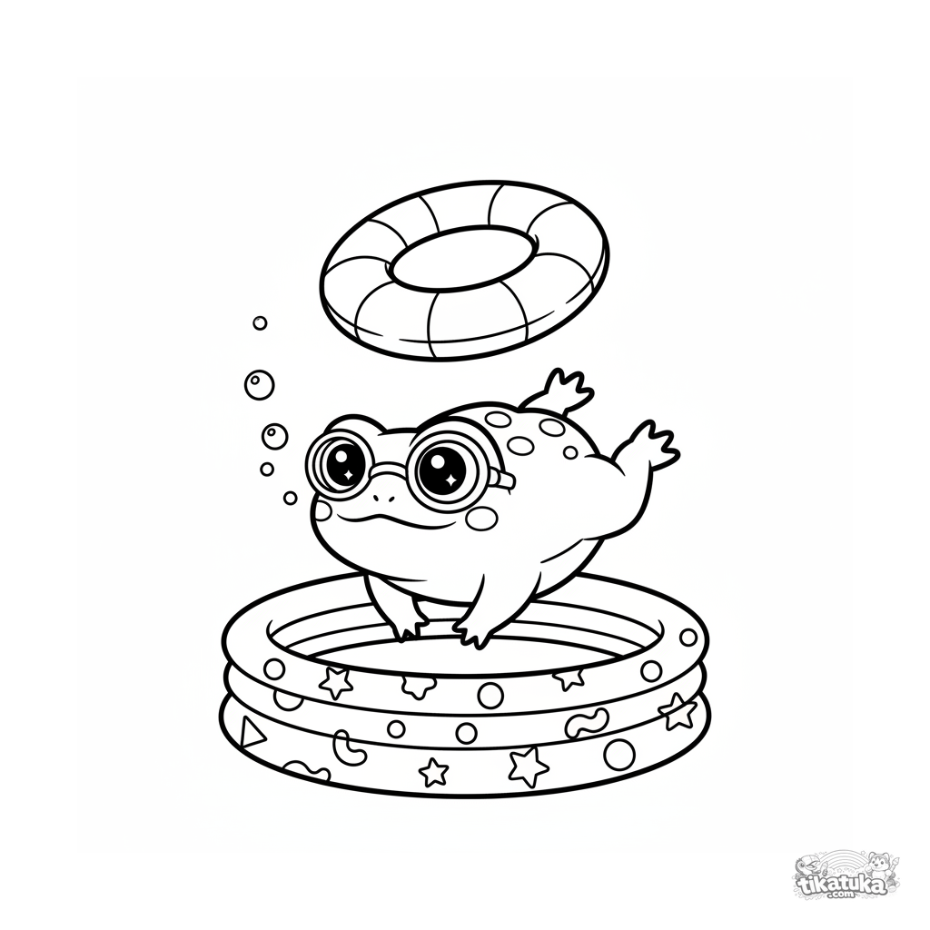 Раскраска для детей 7-9 лет: милый лягушонок в очках для плавания ныряет ко дну надувного бассейна, создавая пузырьки. Динамичная поза и простой фон.
