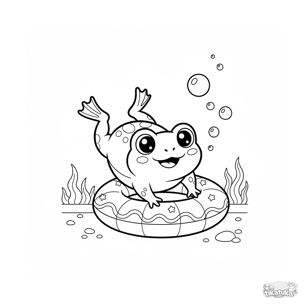 Раскраска для детей 7-9 лет: милый лягушонок в стиле чиби ныряет ко дну бассейна к надувному кругу. Динамичная поза, след из пузырей.