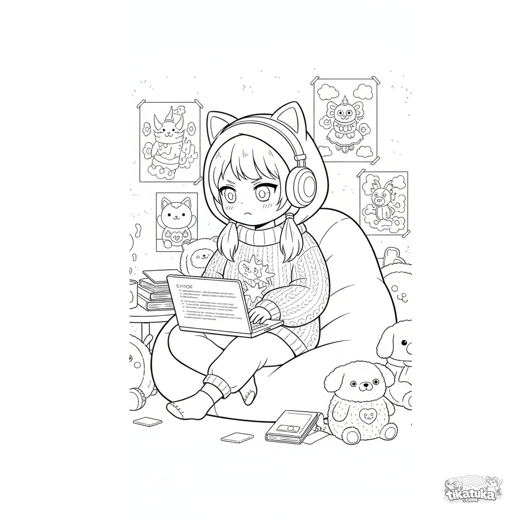 Милая раскраска: хакер в кавай-стиле с наушниками-кошачьими ушками ищет ошибки в коде в уютном подвале. Много деталей: плюшевые игрушки, постеры.