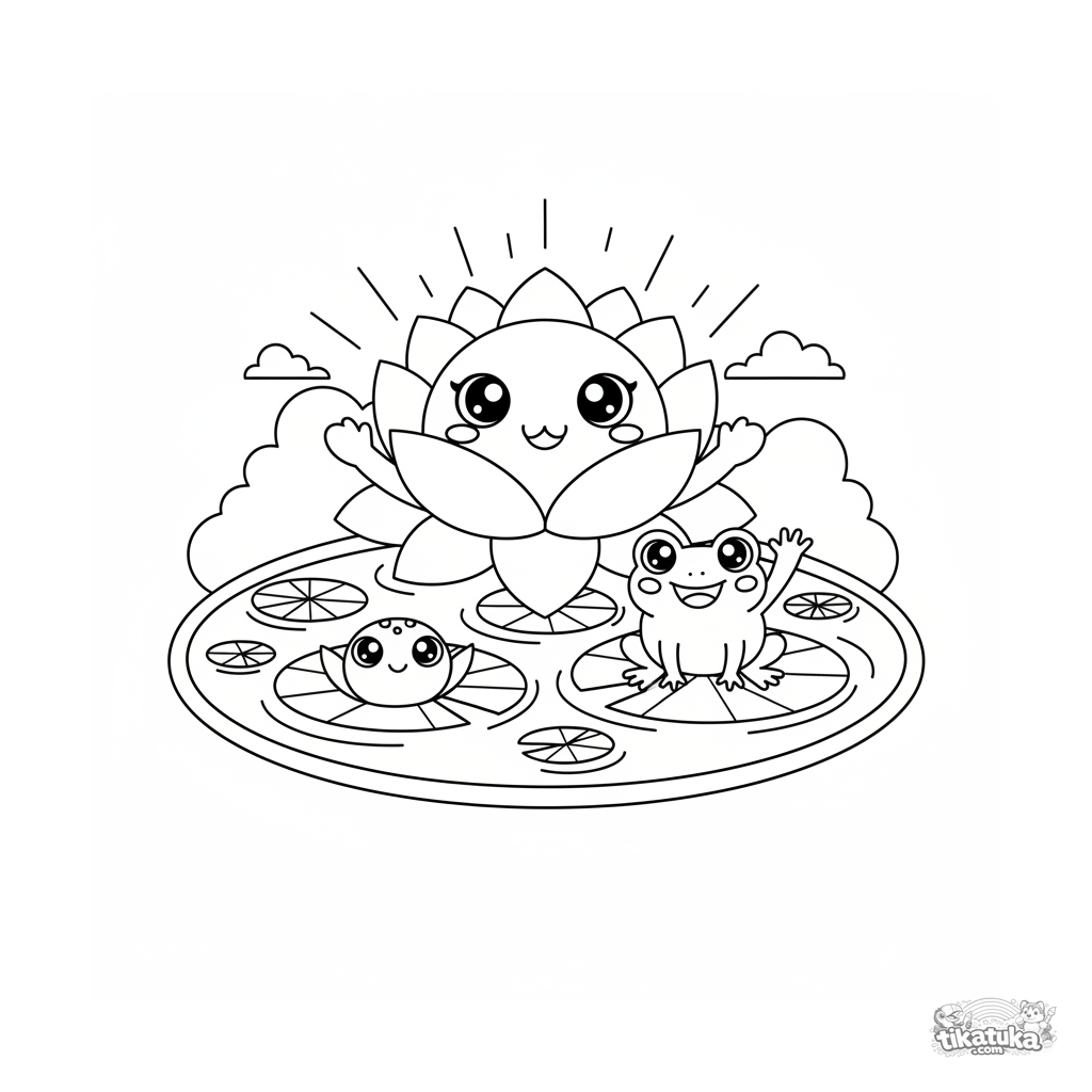 Милая раскраска для детей 4-6 лет: улыбающийся лотос в пруду с лягушкой. Простые формы и дружелюбная сцена для маленьких художников.