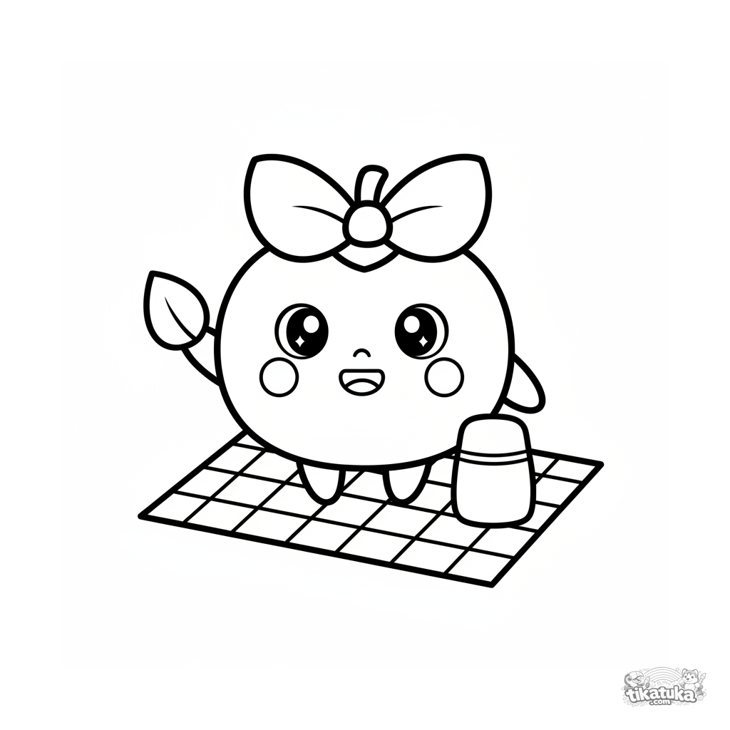 Раскраска для малышей: кавайная хурма с бантиком стоит на клетчатом пледе. Простые формы, широкие поля для легкого раскрашивания детьми 2-3 лет.