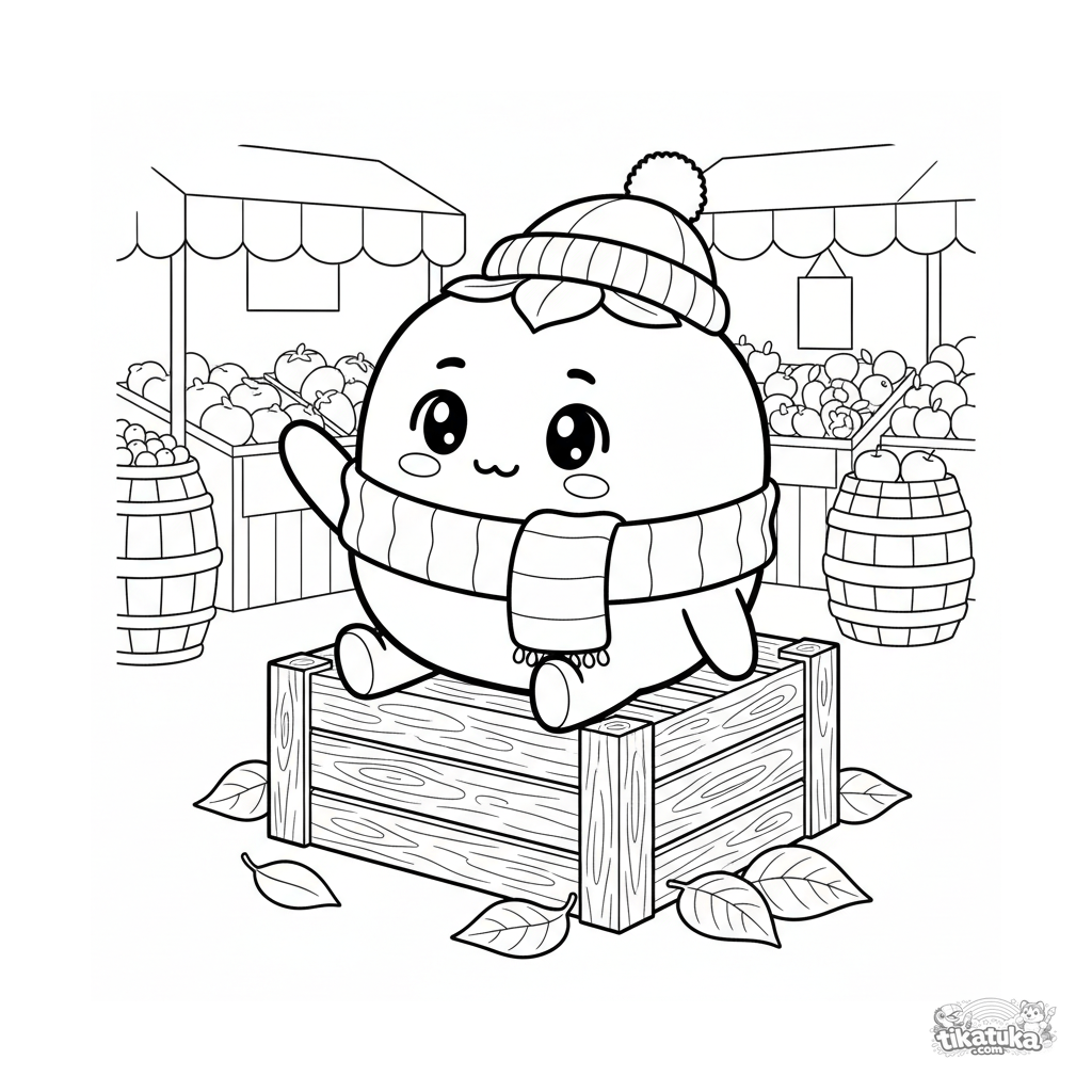 Раскраска с милой хурмой в шарфе на осеннем рынке. Для детей 4-6 лет. Кавайный стиль, простые формы, весёлый сюжет.