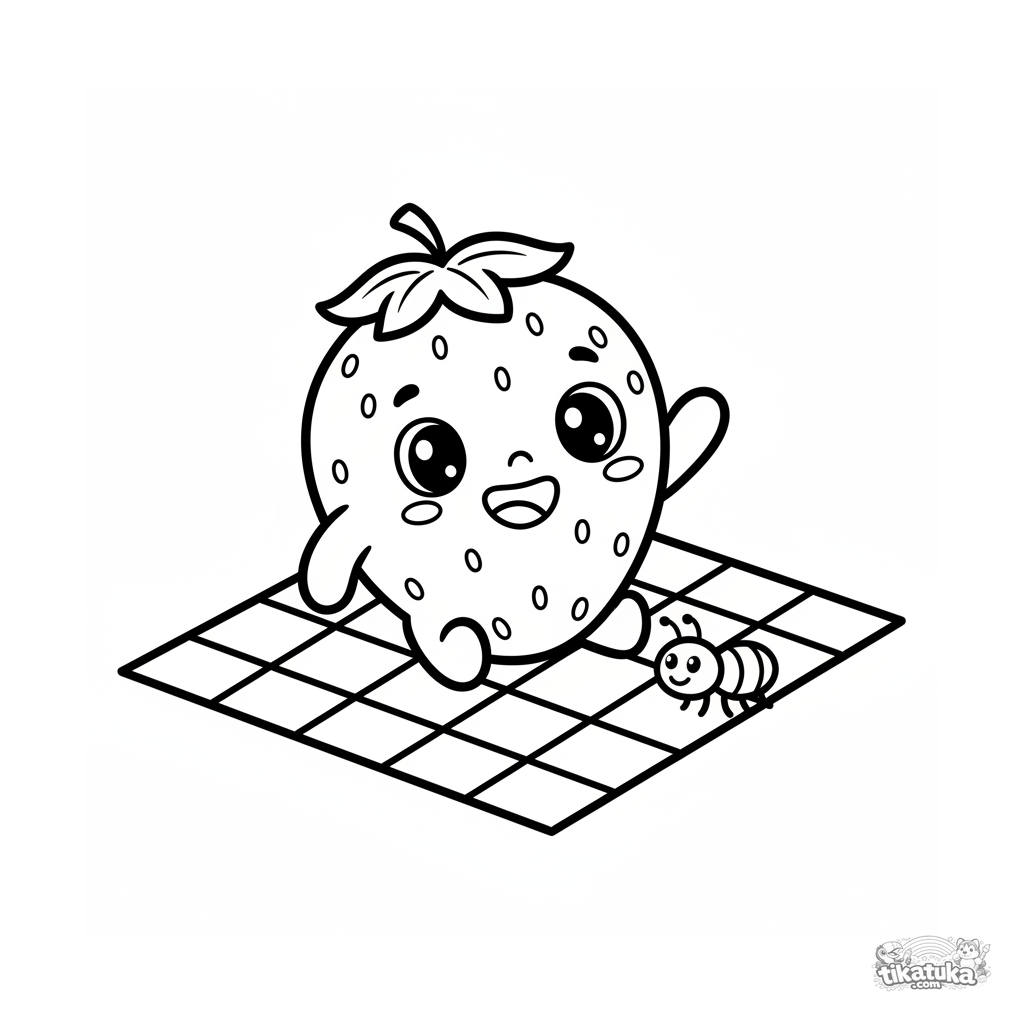 Раскраска для малышей: весёлая клубничка-кавай сидит на клетчатом пледе и машет. Простые формы, широкие поля для раскрашивания.