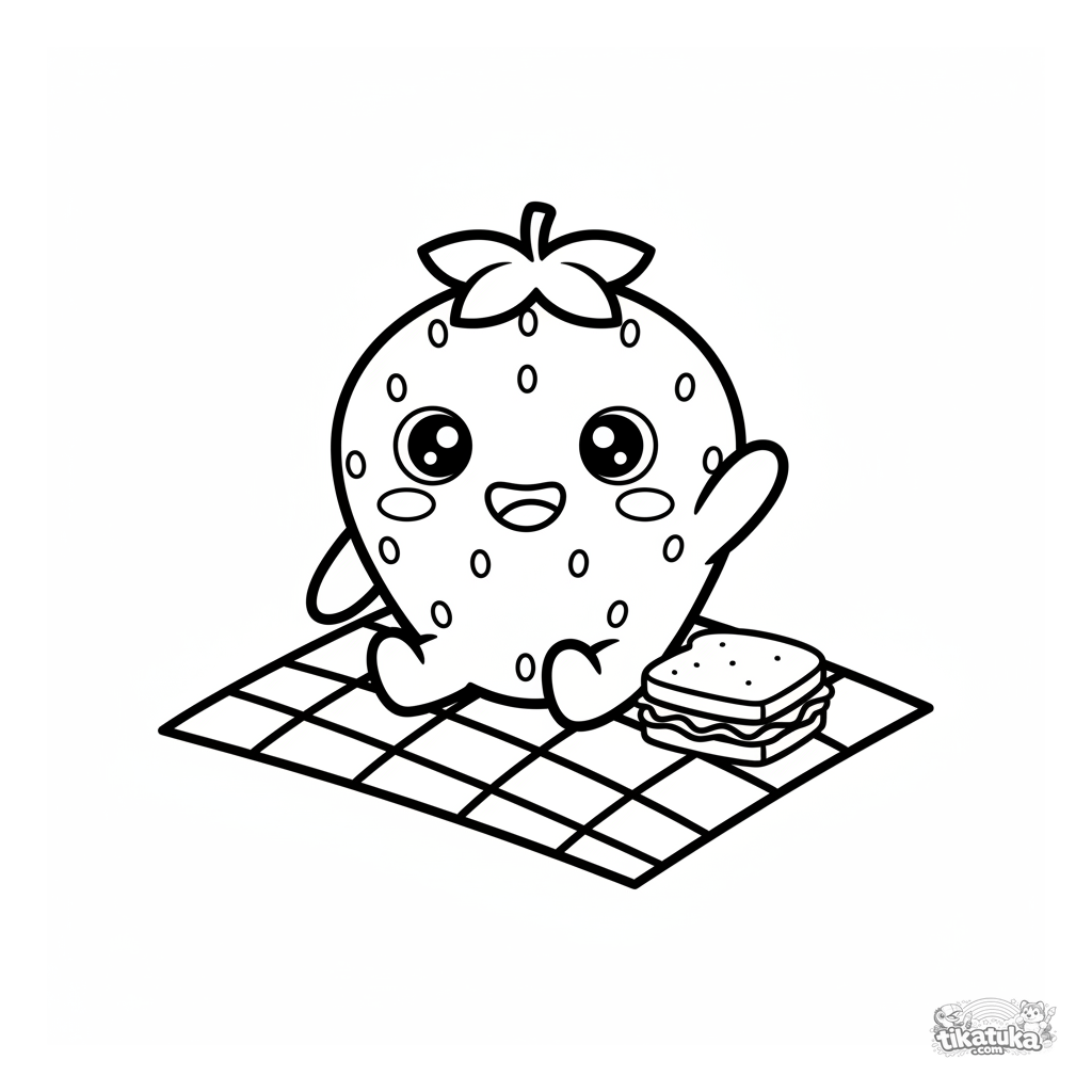 Раскраска для малышей: милая клубничка сидит на клетчатом пледе. Простые формы, широкие поля для легкого раскрашивания самыми маленькими художниками.