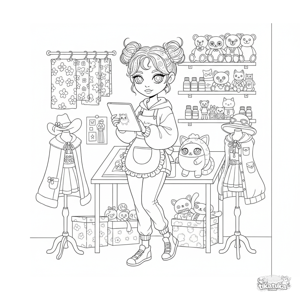 Раскраска для детей 10-12 лет: дизайнер кавай-моды работает в подвальной студии. Детали: планшет, манекены, образцы тканей, плюшевые игрушки и банки с краской.