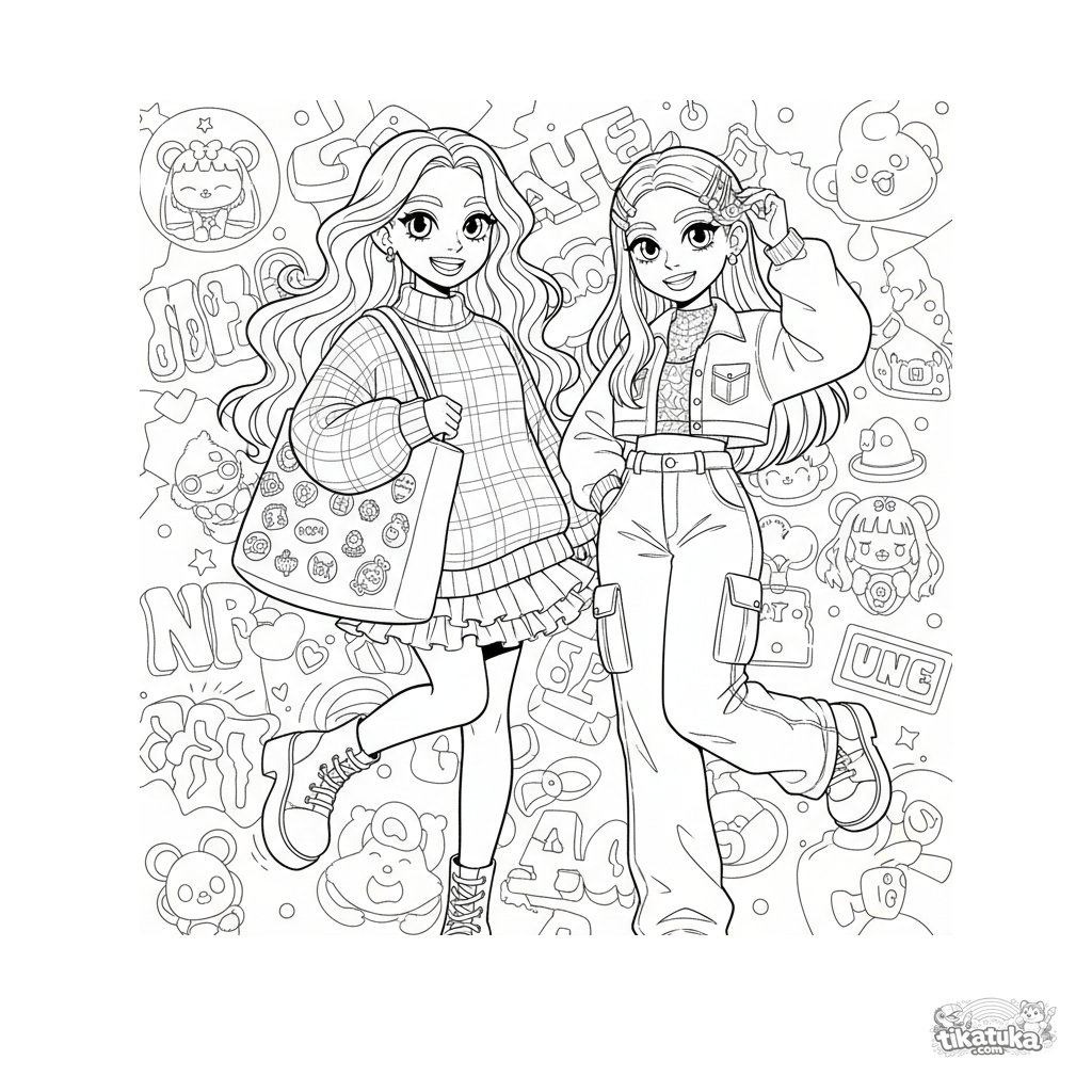 Раскраска для детей 7-12 лет: два подростка в кавайной уличной моде позируют у яркой стены с граффити и стикерами. Сцена полна деталей для творческого раскрашивания.