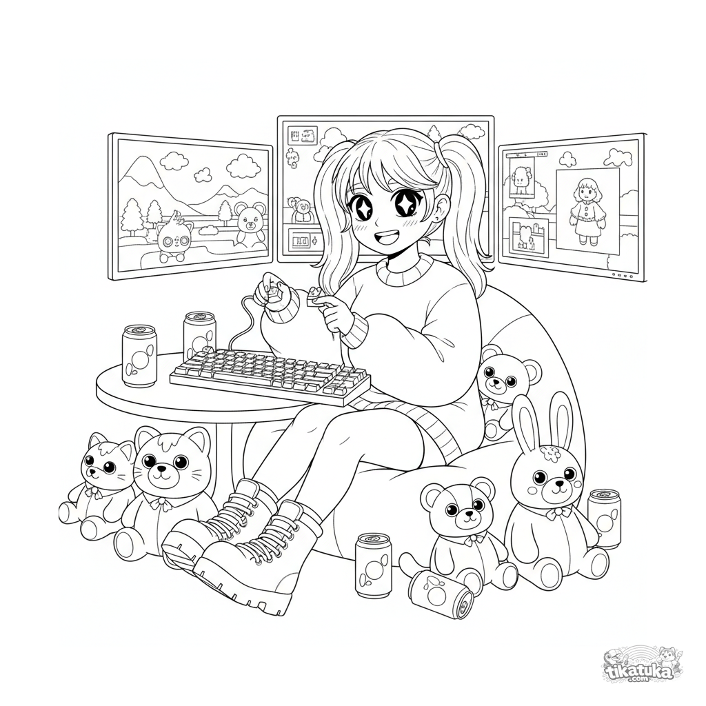 Раскраска для детей 10-12 лет: подросток в кавайной одежде украшает свою клавиатуру в уютном хакерском подвале, полном игрушек и мониторов.