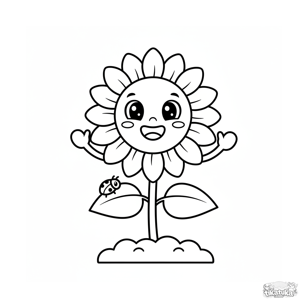 Раскраска для малышей: улыбающийся подсолнух в кавай-стиле машет листиками-руками в саду. Простые формы, широкие поля.