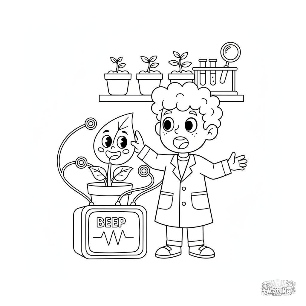 Раскраска для детей 7-9 лет: мальчик в секретной лаборатории проводит эксперимент с говорящим растением. Динамичная сцена в стиле 90-х с чёткими контурами и выразительными эмоциями.