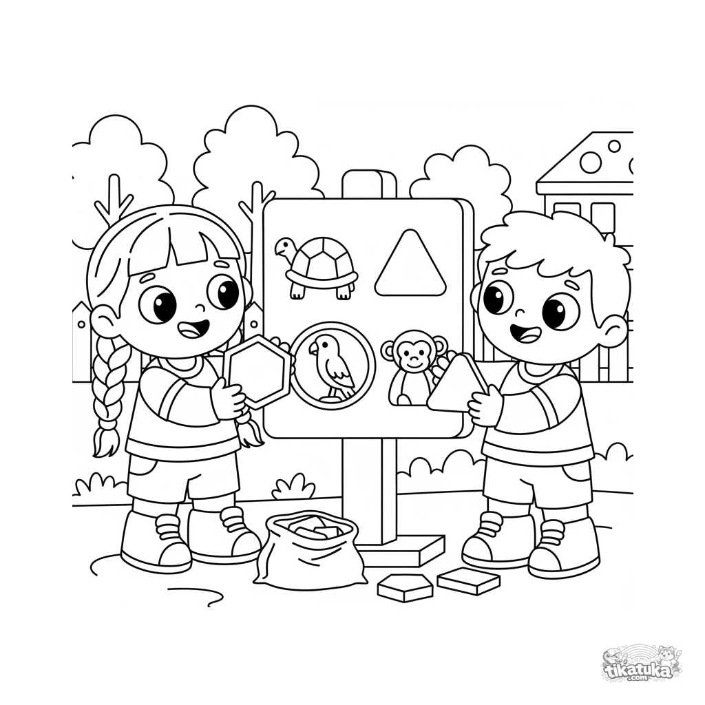 Раскраска для детей 7-9 лет. Дети играют с интерактивной табличкой в зоопарке, сопоставляя геометрические фигуры с силуэтами животных. Сцена для изучения форм.