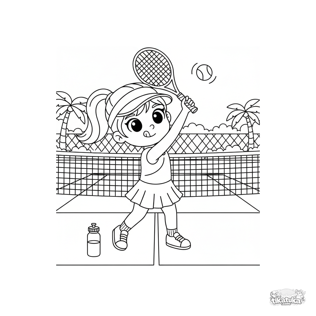 Раскраска для детей 4-6 лет: девочка на теннисном корте учится делать подачу. Яркая сцена с ракеткой, мячом и сеткой, понятные контуры.