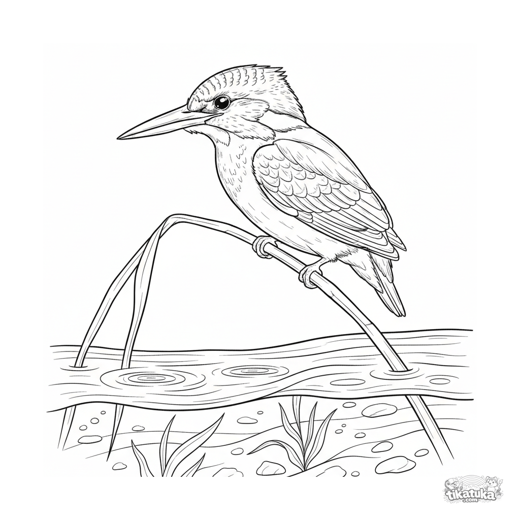 Детальная раскраска для детей 10-12 лет: зимородок в естественной позе на тростнике у ручья. Реалистичный стиль полевого определителя с контурными деталями оперения.