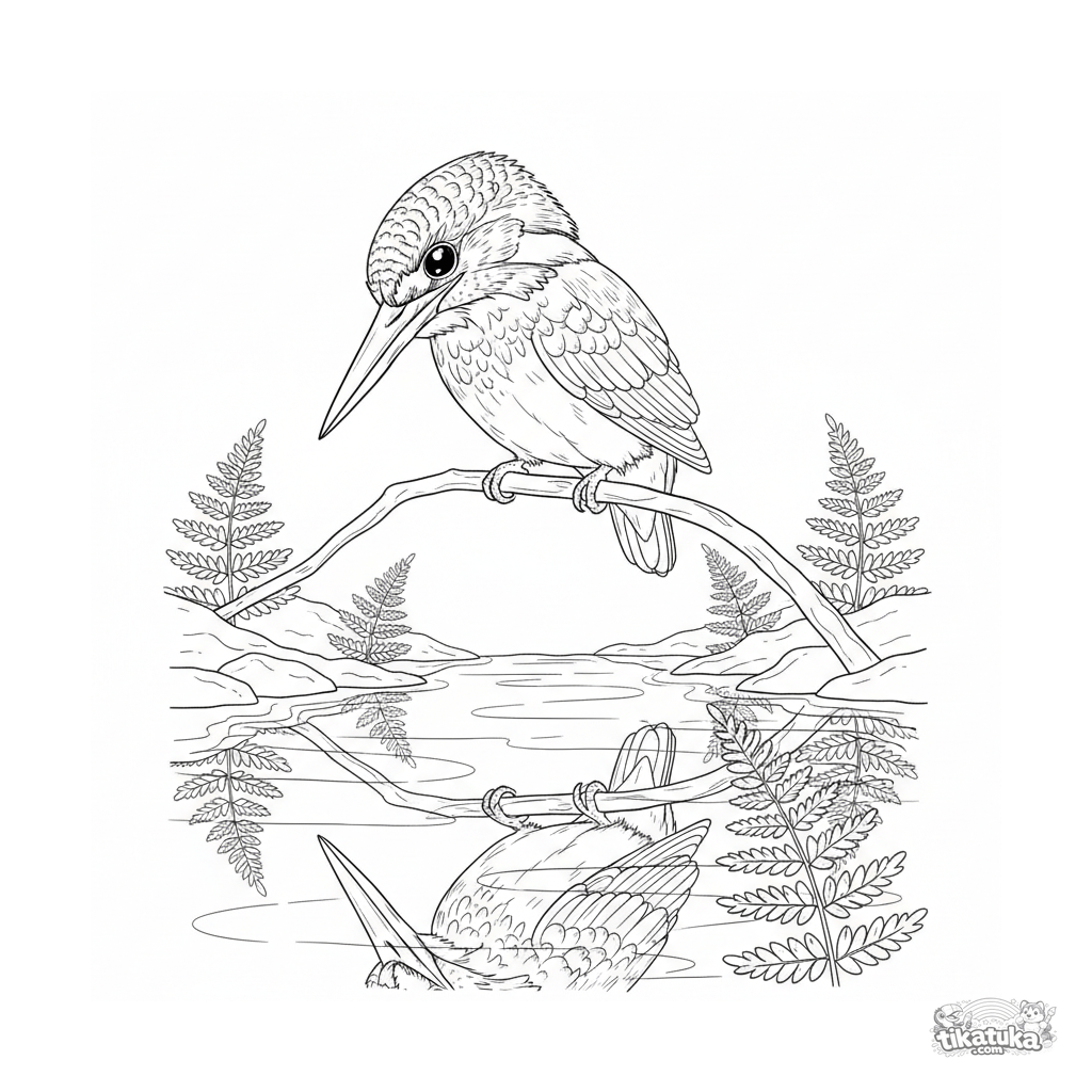 Детальная раскраска для детей 10-12 лет: зимородок на тонкой ветке над прозрачным ручьём внимательно смотрит в воду в поисках рыбы. В стиле полевого определителя.