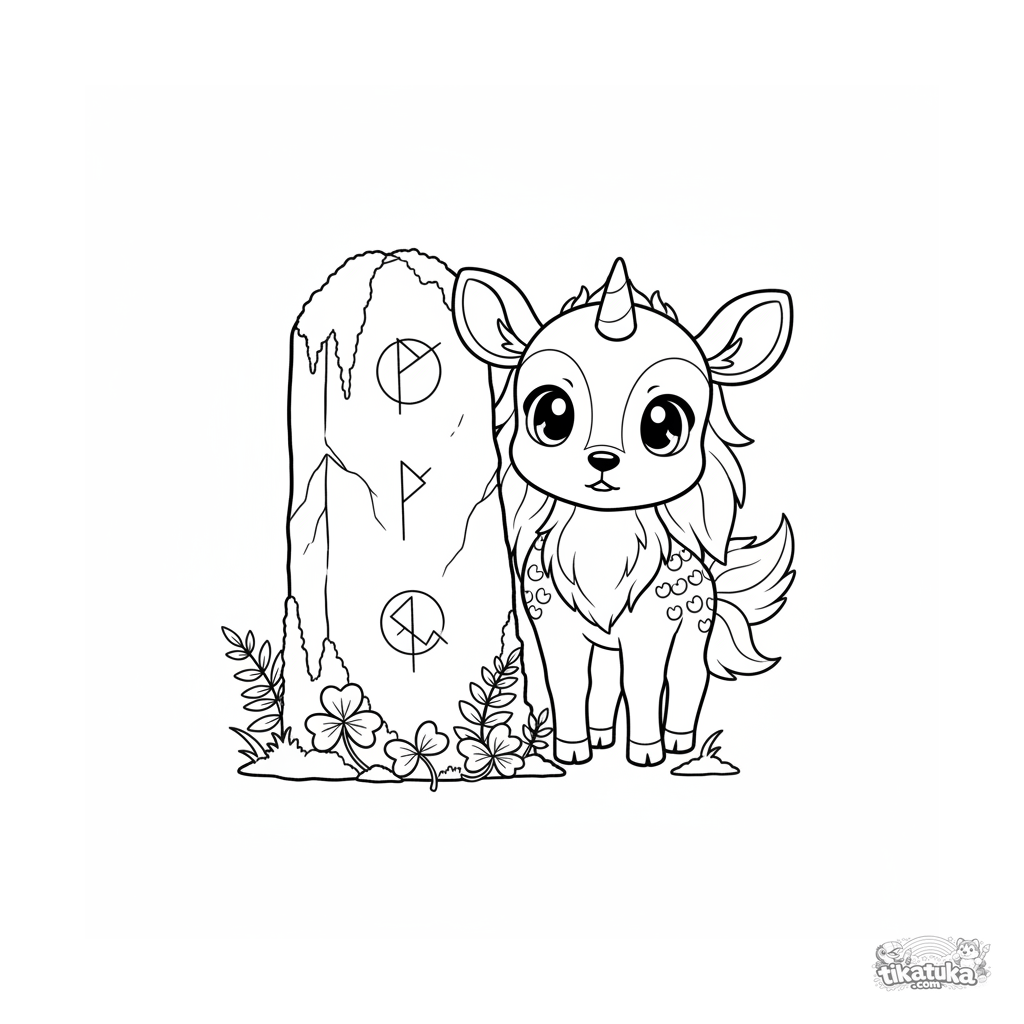 Раскраска для детей 4-6 лет: застенчивый детеныш кирина смотрит из-за огромного мшистого камня с рунами. Четкий основной объект, простой фон, умеренная детализация.