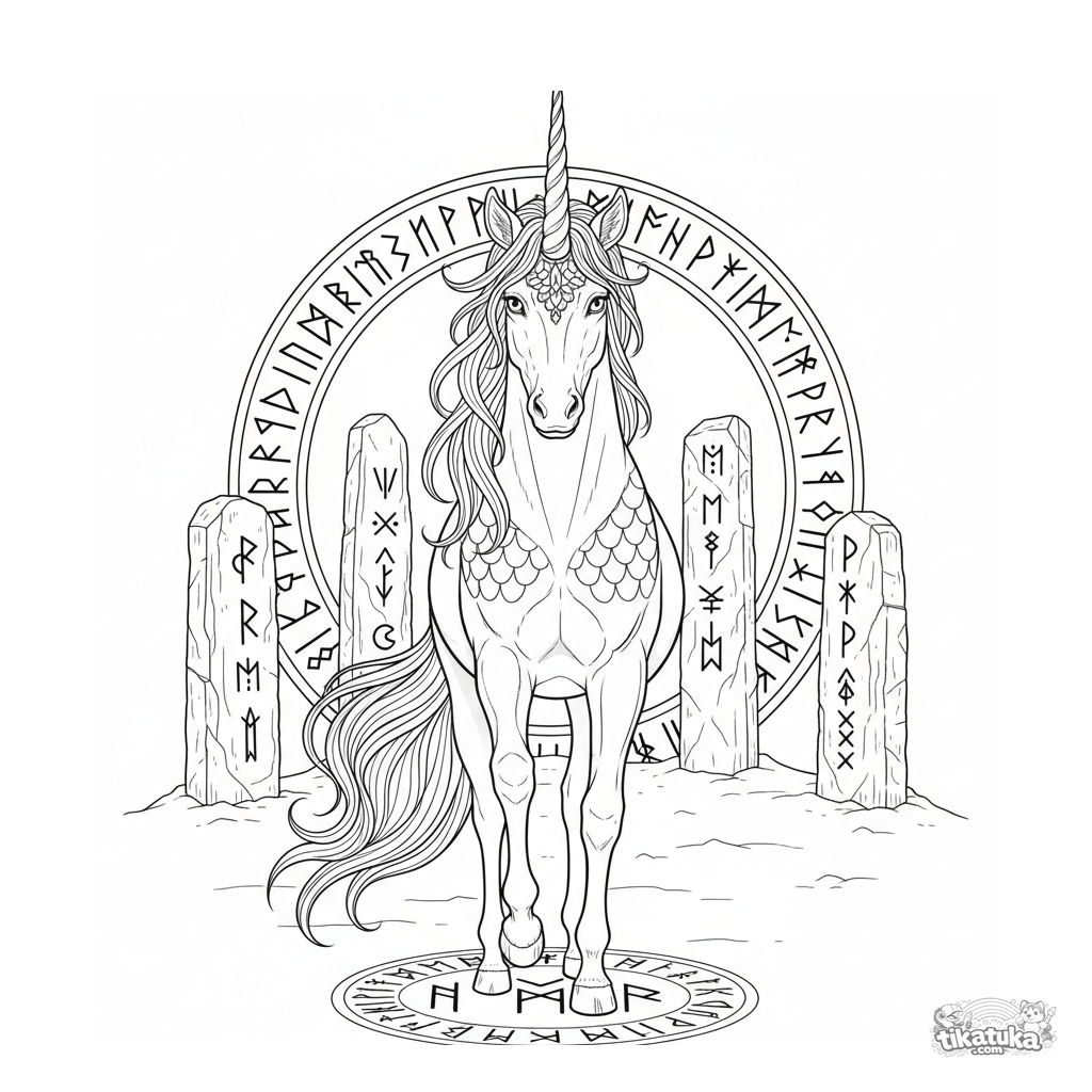 Сложная раскраска для детей 10-12 лет: величественный цилинь охраняет круг древних рунических монолитов. Детальная проработка чешуи, гривы и резных рун.