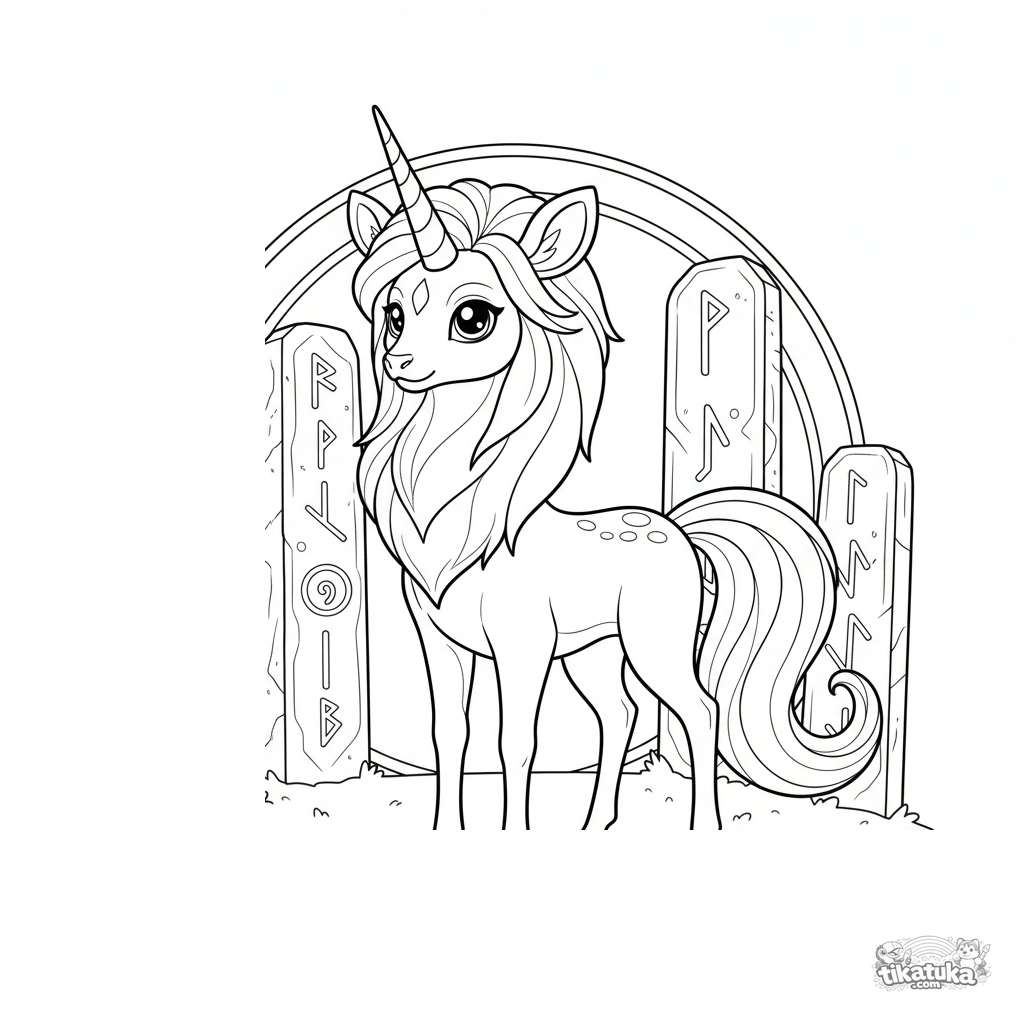 Раскраска с благородным существом кирин, охраняющим круг древних рунических монолитов. Для детей 7-9 лет. Грациозный мифический страж.