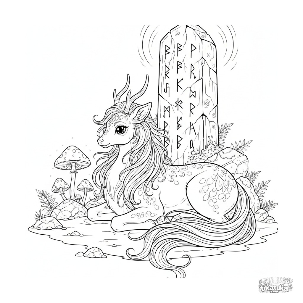 Раскраска для детей 10-12 лет: благородный цилинь отдыхает у основания монолита со светящимися рунами. Детализированная иллюстрация в реалистичном стиле.
