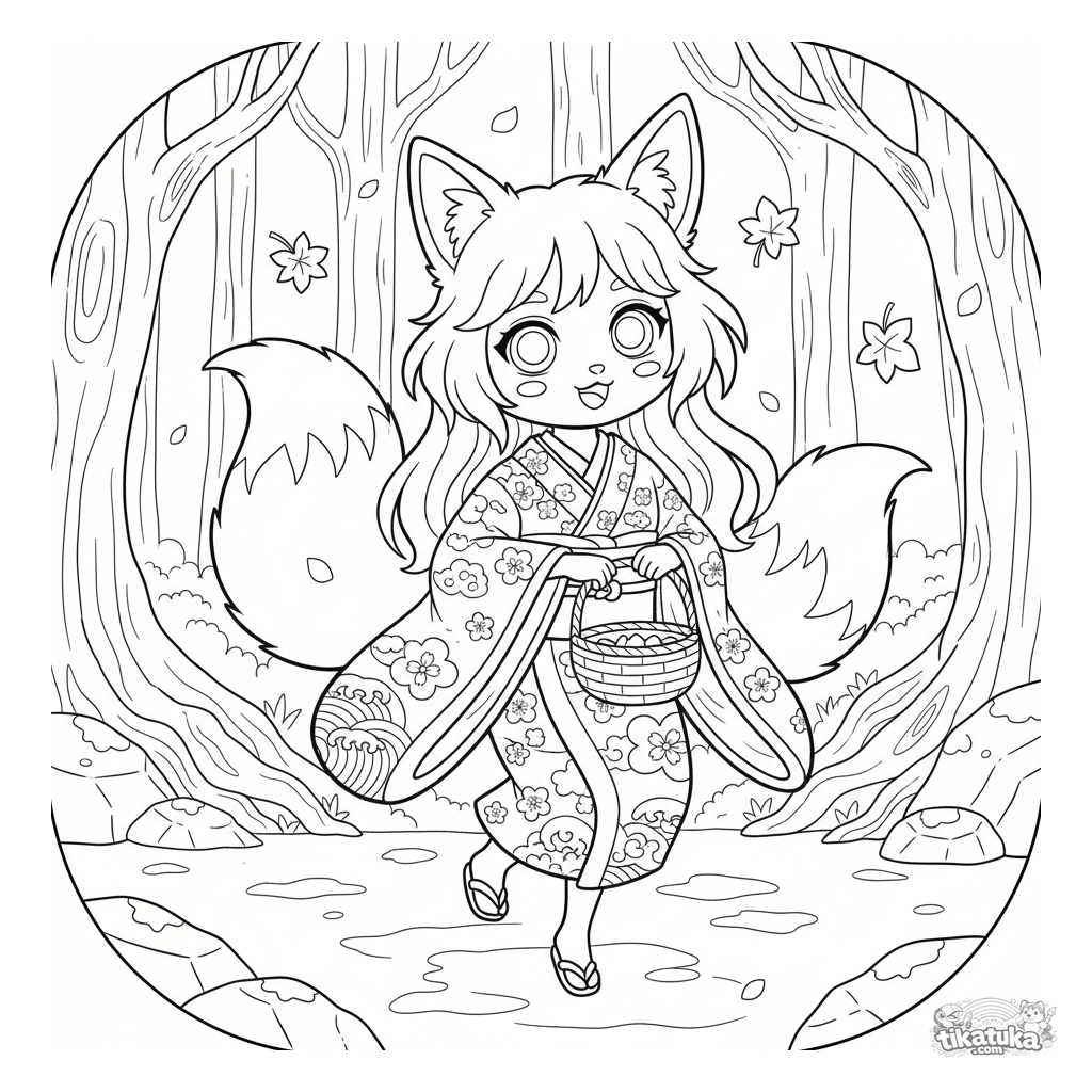 Детальная раскраска в аниме-стиле для детей 10-12 лет: дух кицунэ с двумя хвостами в кимоно весело собирает осенние листья в корзинку в волшебном лесном уголке.