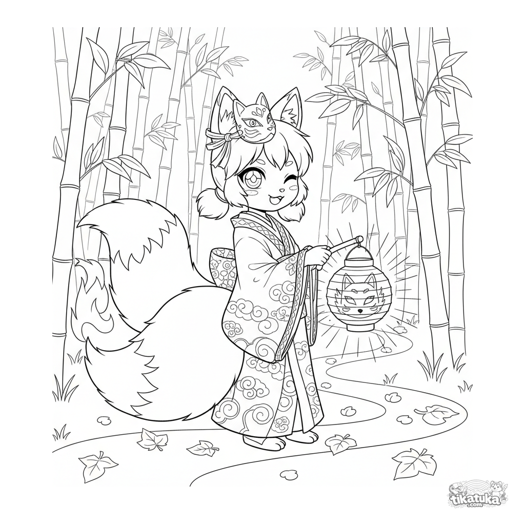 Детализированная раскраска аниме: дух кицунэ с двумя хвостами ведёт через таинственный бамбуковый лес осенней ночью. Сцена с фонарём, листьями и сложным фоном для детей 10-12 лет.