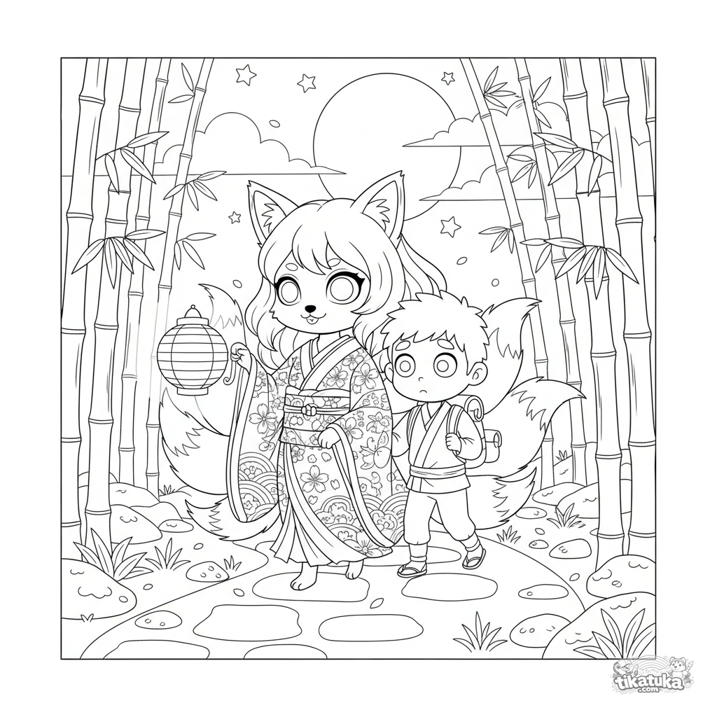 Раскраска в стиле аниме для детей 10-12 лет: дух лисы-кицунэ с фонарём ведёт заблудившегося путника через таинственный бамбуковый лес при лунном свете.