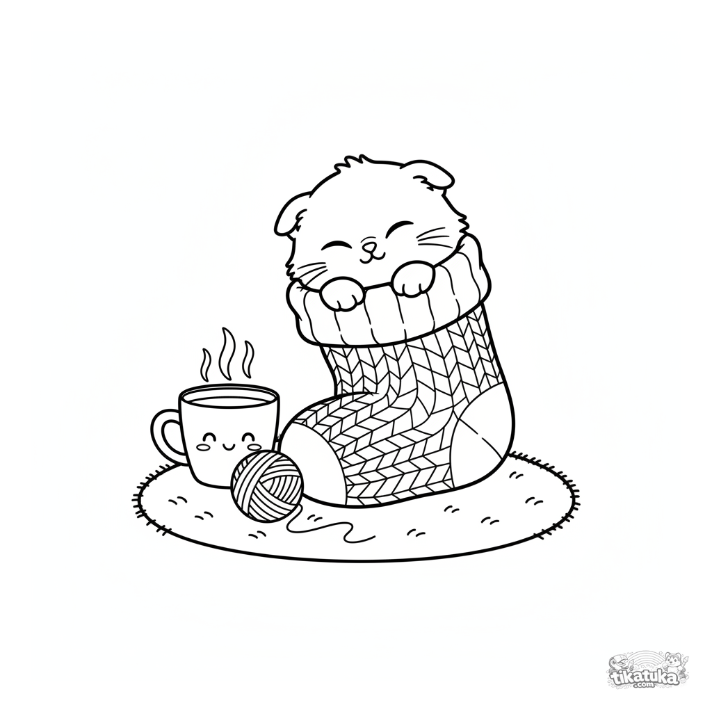 Простая раскраска для малышей 2-3 лет: пушистый котёнок сладко спит, свернувшись в большом вязаном носке, рядом стоит кружка.