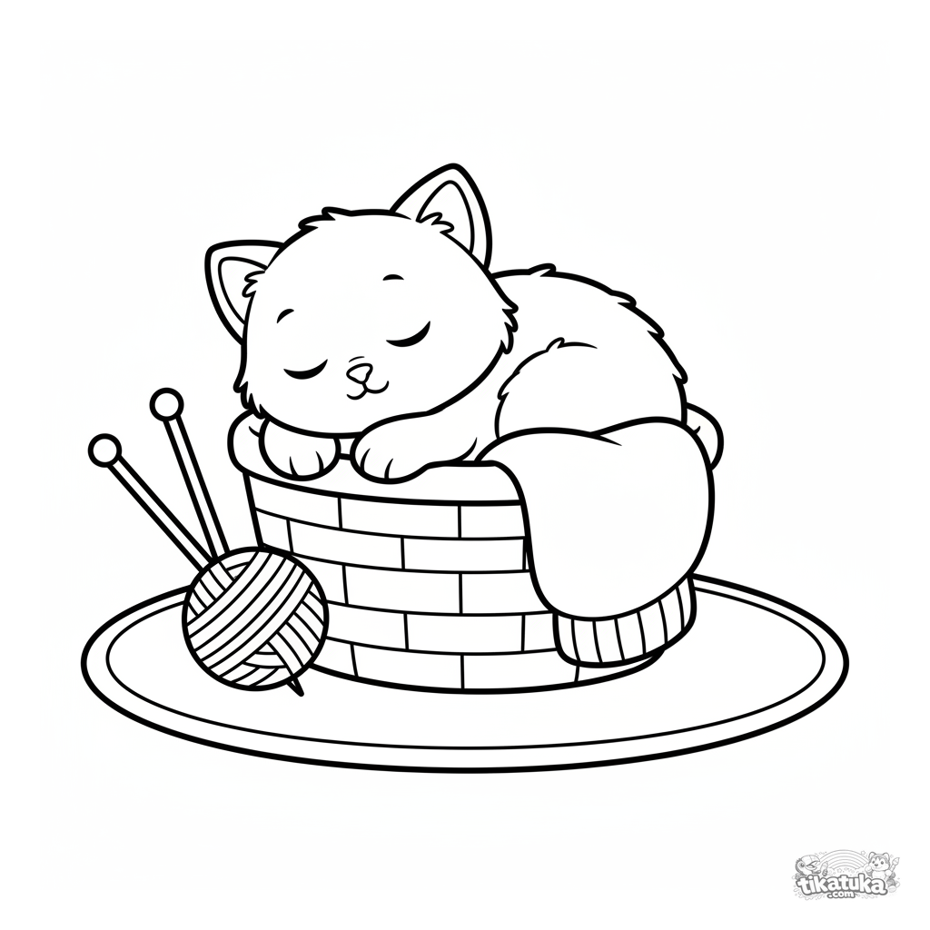 Простая раскраска для малышей 2-3 лет: пушистый котенок сладко спит в уютной корзинке со свитером. Крупные формы, мало деталей.