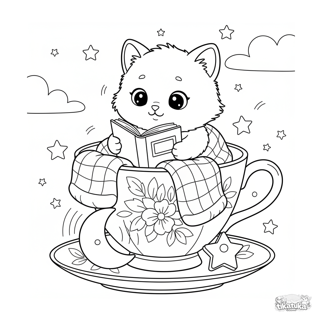 Раскраска для детей 4-6 лет: уютный котёнок читает книжку в большой чашке при лунном свете. Милая и спокойная сцена для раскрашивания.