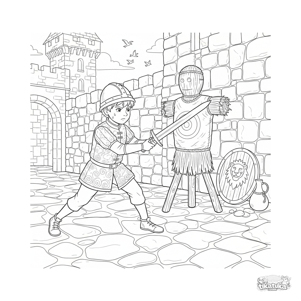 Раскраска для детей 6-9 лет: юный рыцарь тренируется с деревянным мечом на соломенном чучеле во дворе замка. Детализированная реалистичная сцена.