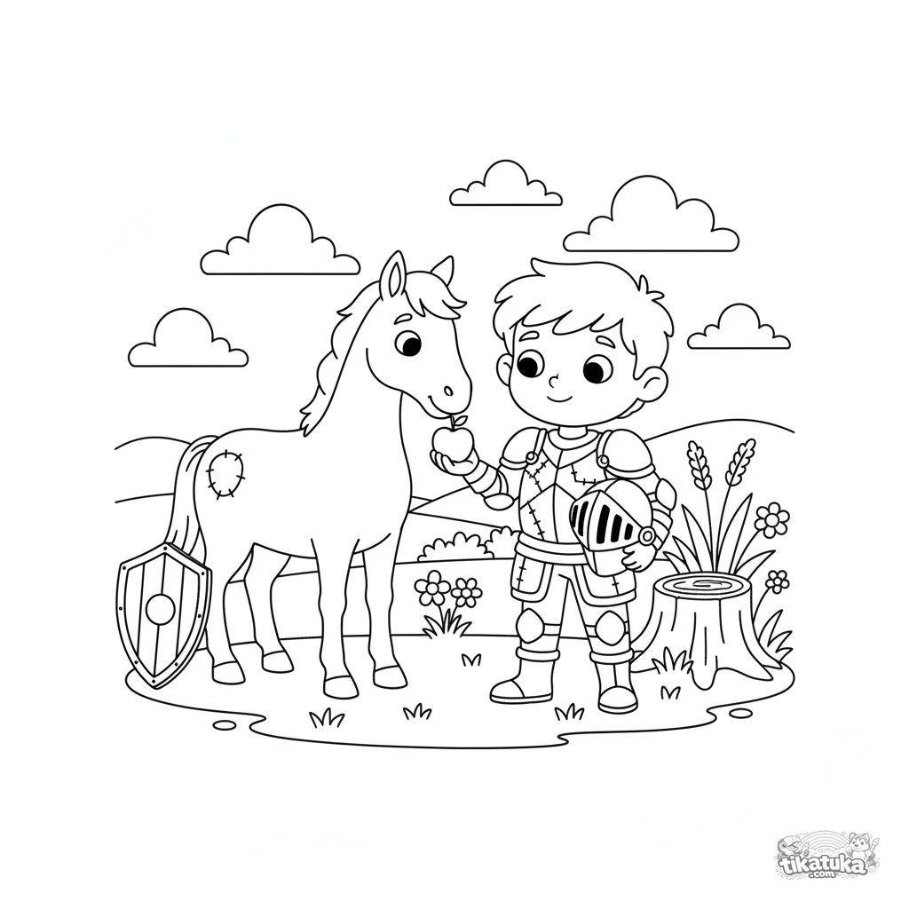 Раскраска для детей 4-6 лет: добрый рыцарь в смешных лоскутных доспехах кормит яблоком своего коня на солнечном лугу. Сцена про дружбу.