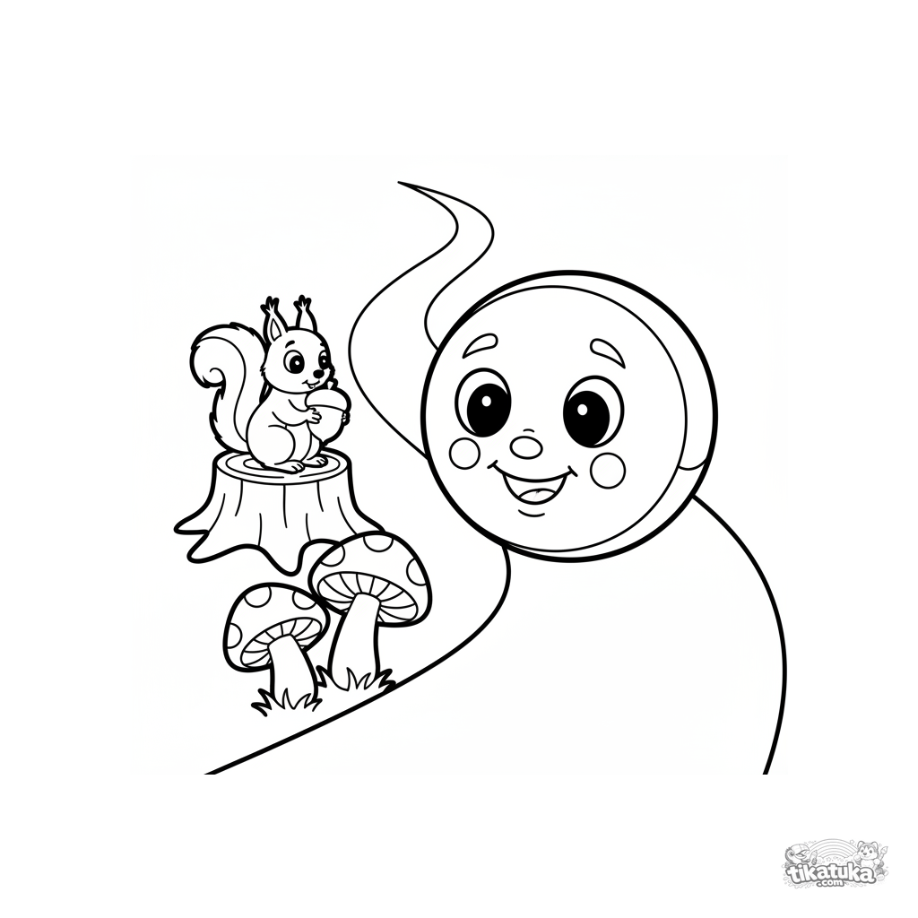 Раскраска для малышей 2-3 года: Колобок из русской сказки катится по лесной дорожке мимо белочки. Очень простые, крупные формы, толстые контуры.