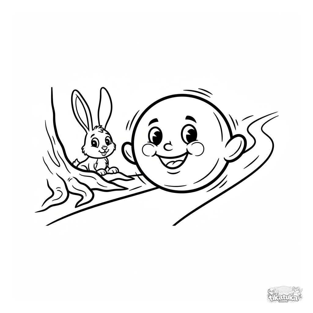Раскраска для малышей 2-3 лет: весёлый Колобок катится по лесной тропинке, а за ним наблюдает зайчик. Очень простые, крупные формы и толстые контуры идеальны для первых раскрасок.