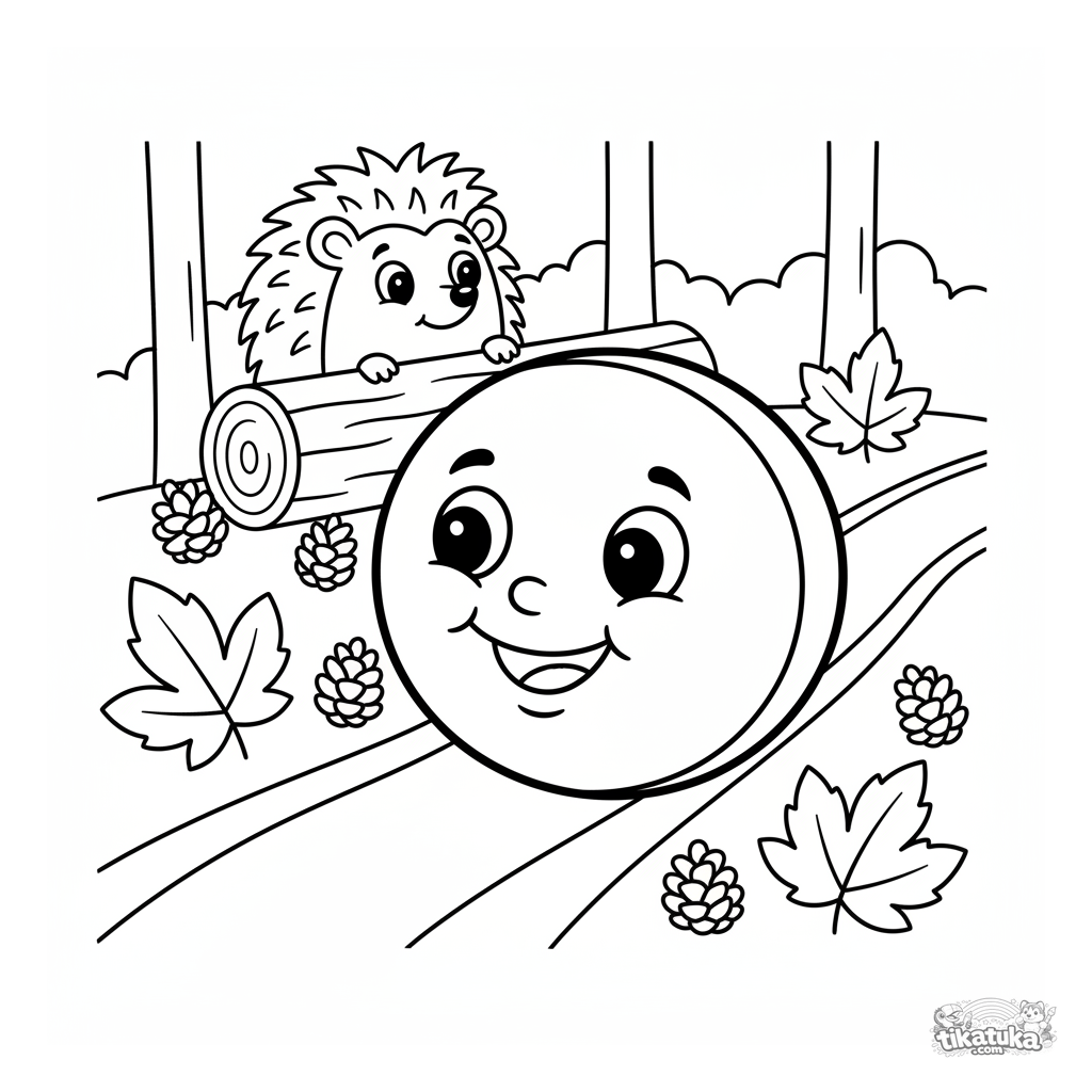 Раскраска для малышей 2-3 года: весёлый Колобок катится по извилистой лесной тропинке мимо ёжика. Очень простые, крупные формы, идеально для первых карандашей.