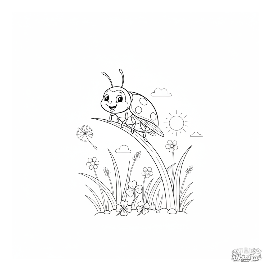 Раскраска с божьей коровкой. Для детей 4-6 лет. Божья коровка балансирует на кончике травинки на солнечном лугу, рядом летит семя одуванчика.