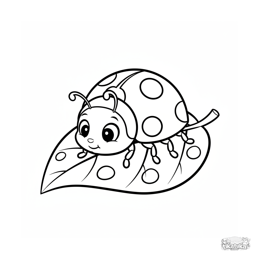 Раскраска для малышей: божья коровка ползёт по большому зелёному листу с каплями росы. Простые формы, широкие поля для лёгкого раскрашивания.
