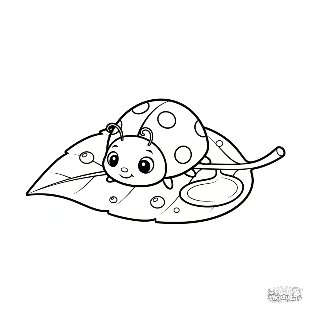 Раскраска для малышей: божья коровка ползёт по большому зелёному листу с каплями росы. Простые формы, широкие поля, идеально для детей 2-3 лет.