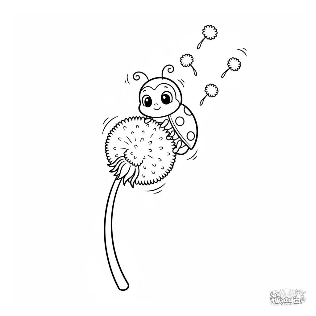 Простая раскраска для малышей 2-3 лет с божьей коровкой. Крупное насекомое ползёт по стеблю пушистого одуванчика на лугу.