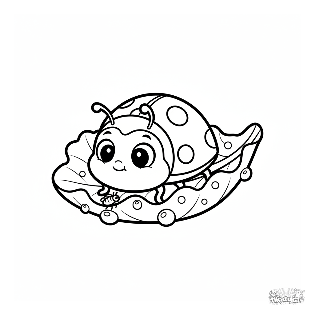 Раскраска для малышей 2-3 лет: пухлая божья коровка стоит на кудрявом листе салата в огороде, смотрит на крошечную тлю. Простые формы, крупные детали.