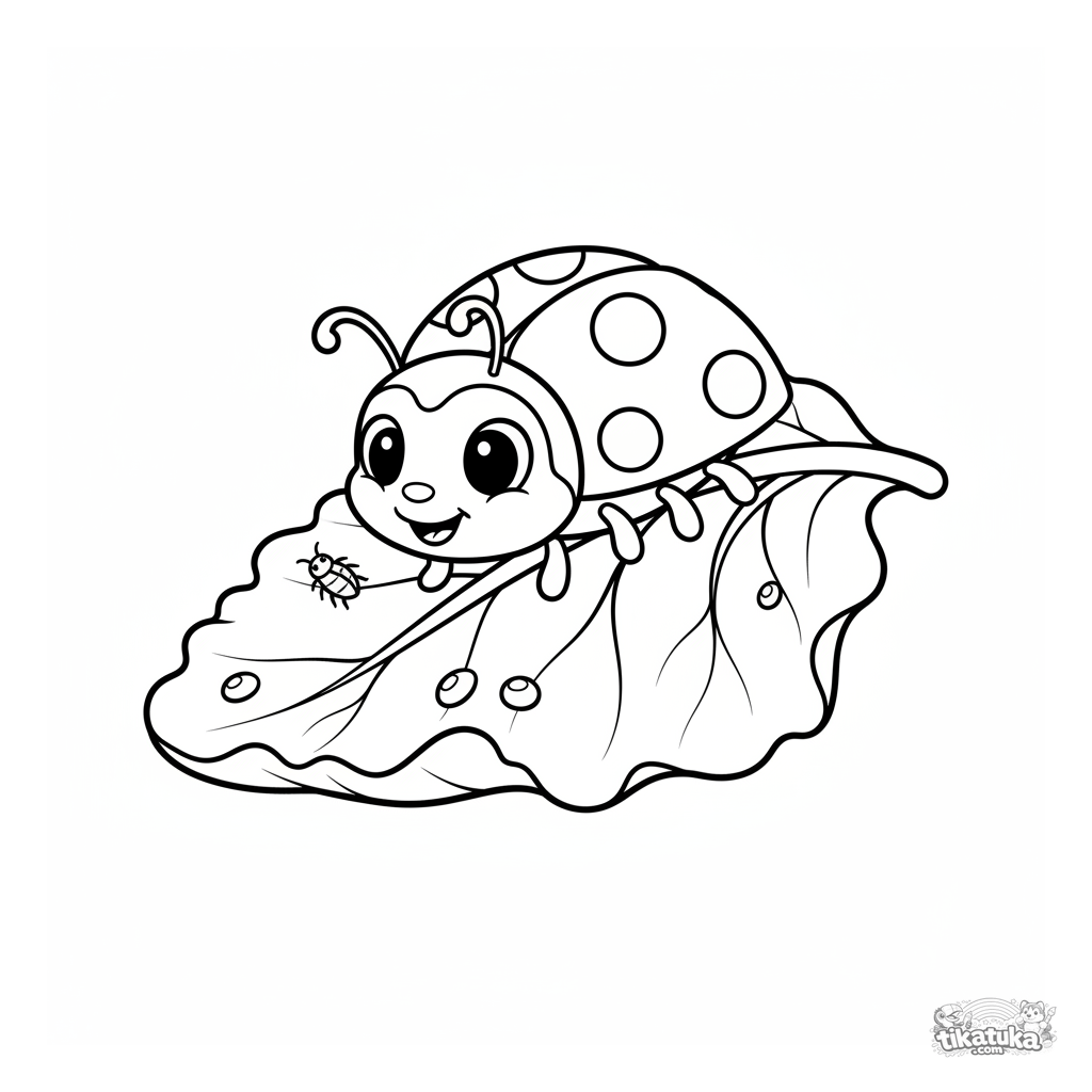 Простая раскраска для малышей 2-3 лет с божьей коровкой. Божья коровка ползет по большому кудрявому листу в огороде.