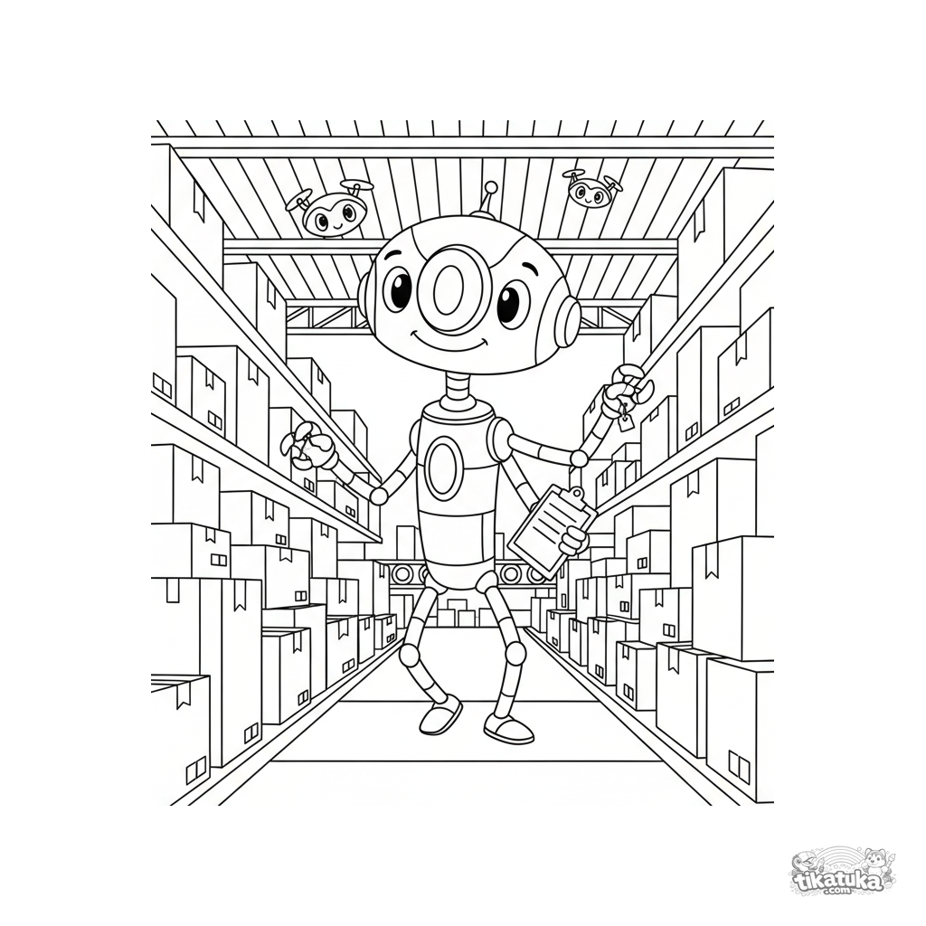Раскраска для детей 7-9 лет: высокий ретро-робот ведет инвентаризацию на складе. Забавные резиновые конечности и стиль старых мультфильмов.