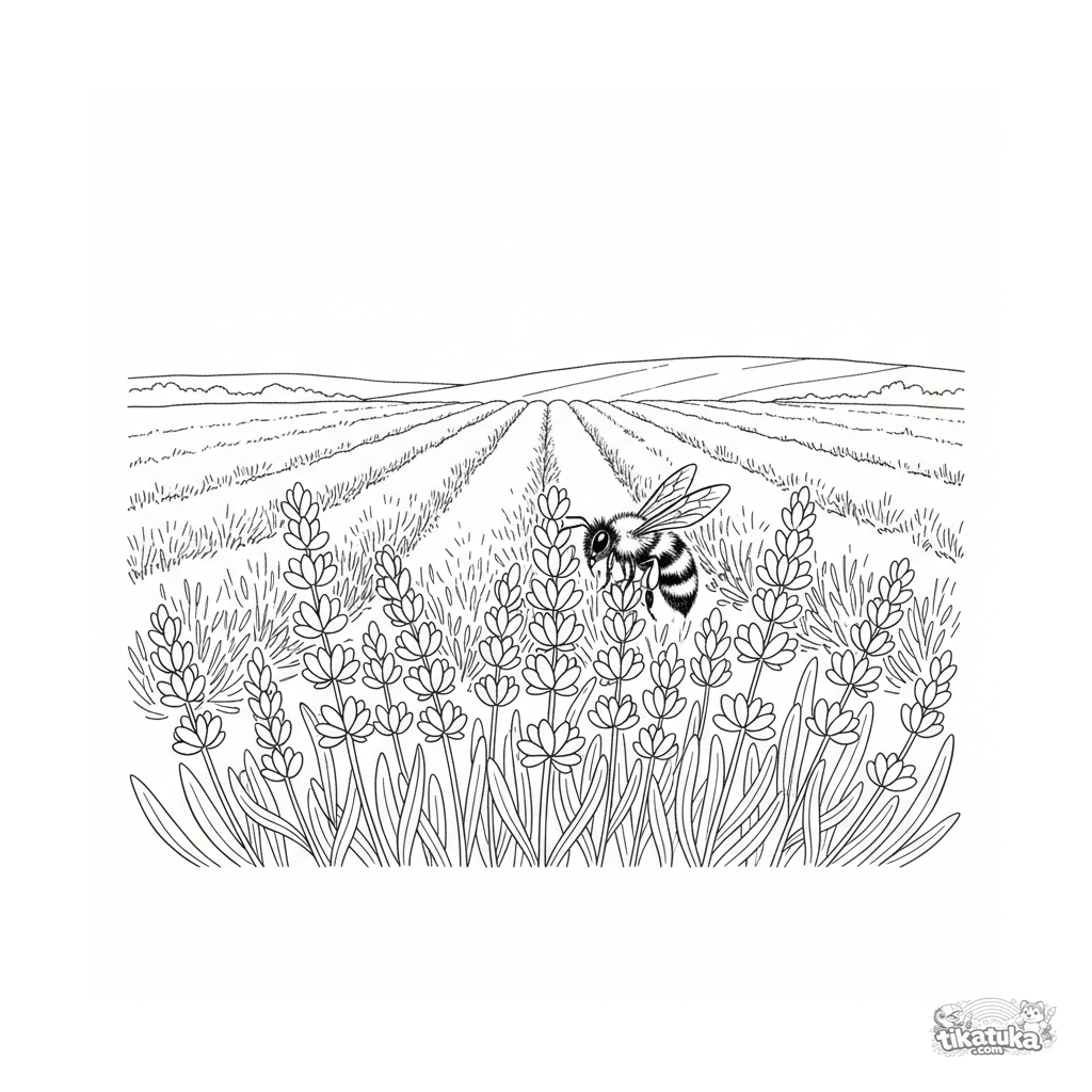 Раскраска для детей 10-12 лет: детализированный пейзаж лавандового поля с пчелой и холмом на горизонте. Высокая детализация, акварельный набросок.