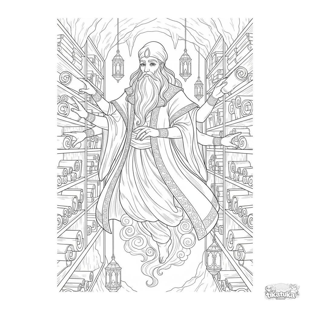 Сложная раскраска в стиле старинной гравюры для детей 10-12 лет: джинн-библиотекарь упорядочивает древние свитки в подземном хранилище.
