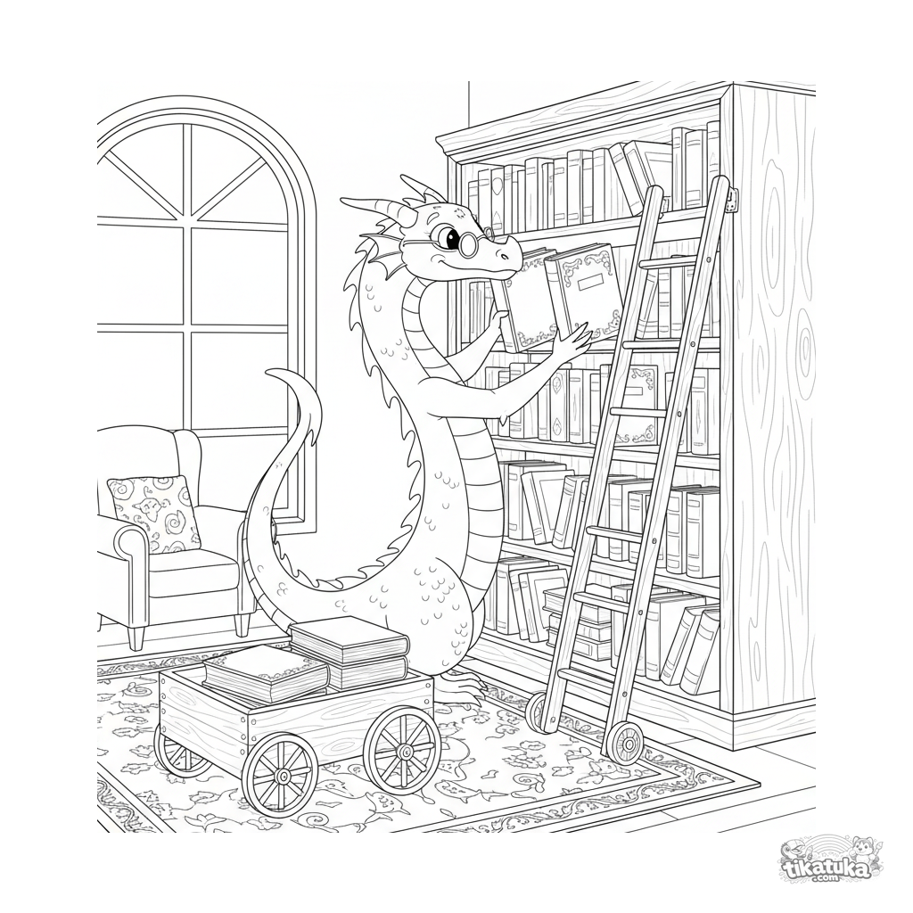 Раскраска для детей 10-12 лет: дракон-библиотекарь в школьном классе аккуратно расставляет книги. Детализированная фэнтези-сцена для раскрашивания.