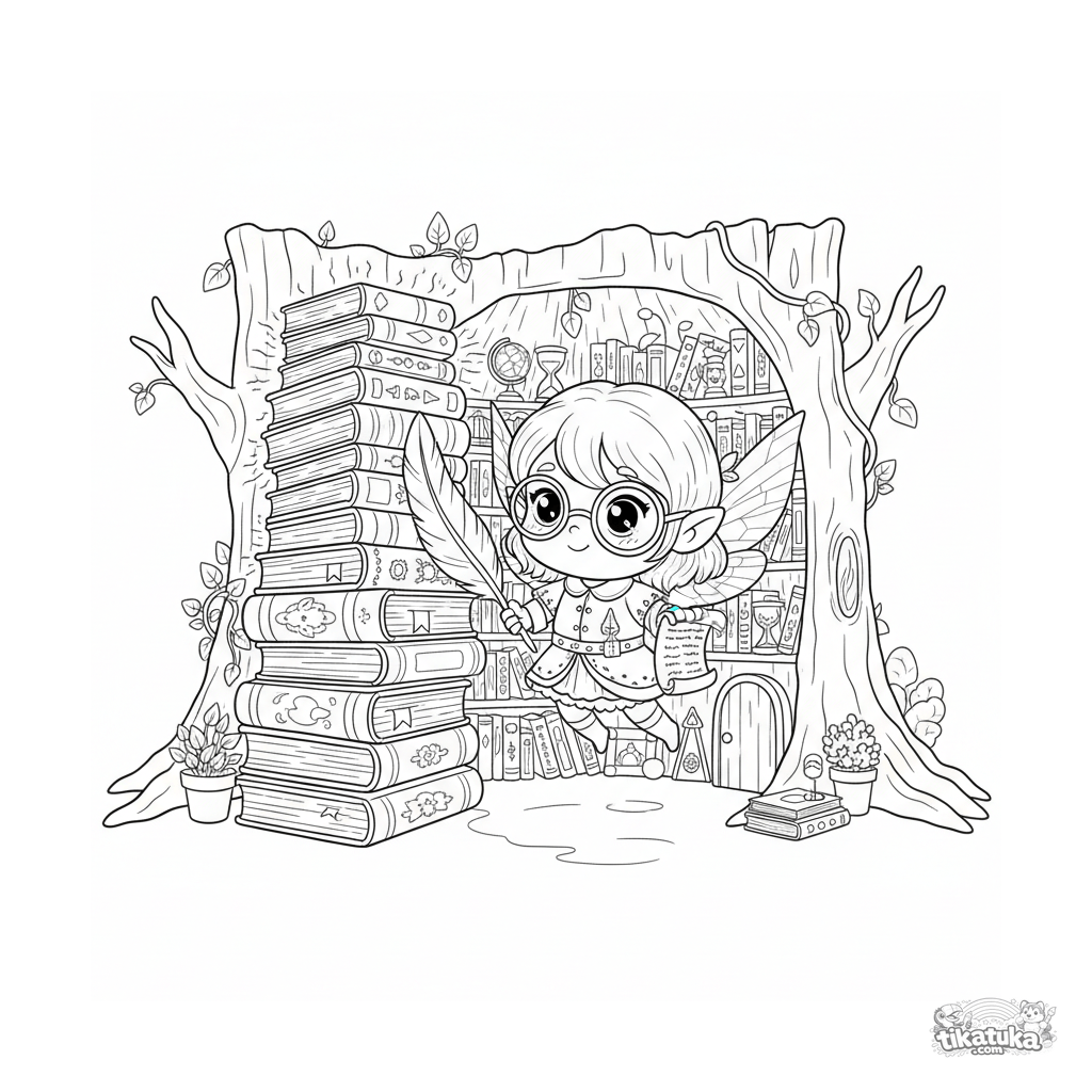 Раскраска для детей 10-12 лет: пикси-библиотекарь организует светящиеся книги в миниатюрной библиотеке внутри пня. Детальная сцена с множеством элементов, широкие поля для творчества.